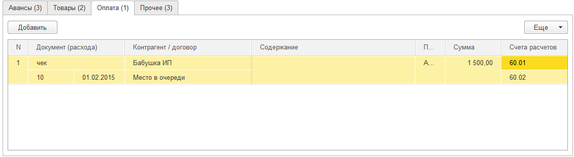 Затраты подотчетного лица на оплату поставщикам фиксируются на закладке «Оплата».