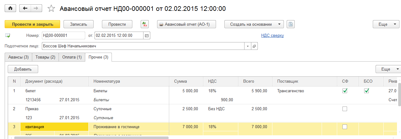 02 февраля отразите в учете авансовый отчет подотчетного лица Боссова Шефа Начальниковича: