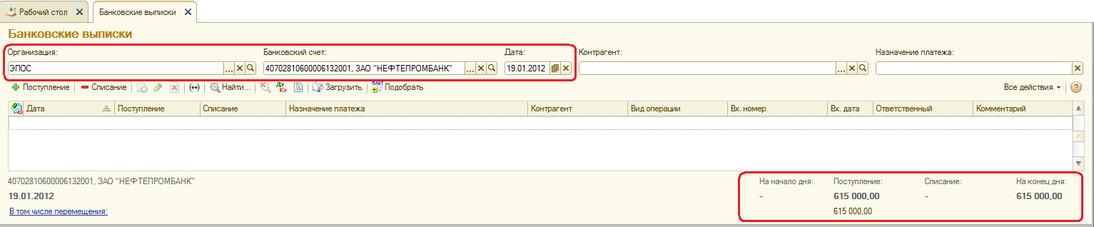 Получена выписка банка №1 о зачислении 19.01.2012 на расчетный счет ЗАО ЭПОС 615 000.00 руб.