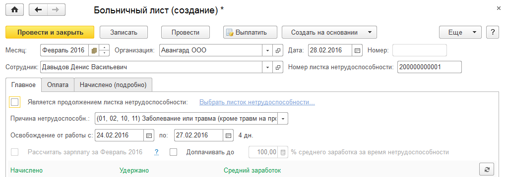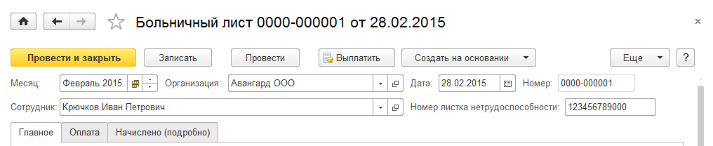 В шапке документа указывается месяц начисления, сотрудник и номер листа нетрудоспособности. Для заполнения предназначены закладки "Главное" и "Оплата".