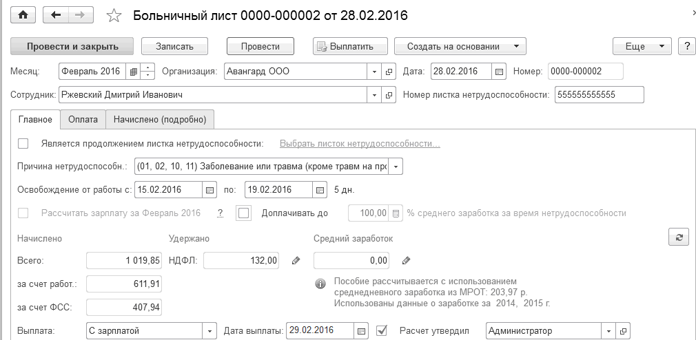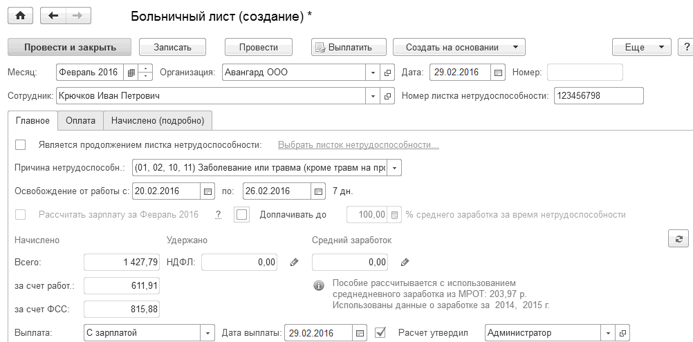 Сотрудник ООО "Авангард" Крючков И.П. принес больничный лист по общему заболеванию с 20.02 по 26.02. Отразим ситуацию в программе. Для этого из раздела "Зарплата / Больничные листы" создадим новый документ "Больничный лист" и заполним условия. Сумма пособия будет рассчитана автоматически (выплата производится в зарплату).