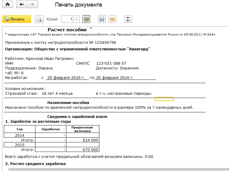 Проведем документ. Выведем на печать расчет к листку нетрудоспособности.