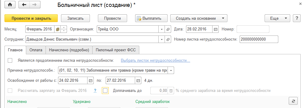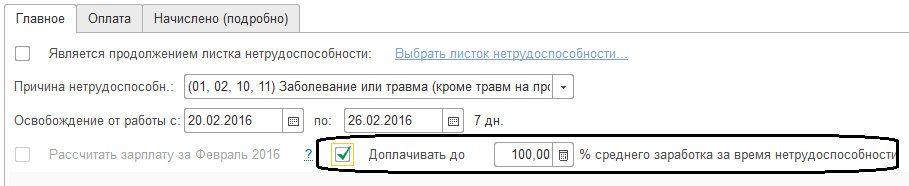Причина нетрудоспособности выбирается в соответствии с первичным "бумажным" документом. От выбора причины нетрудоспособности зависит используемый алгоритм расчета. Так, заболевание или травма в быту предполагают 3 дня за счет работодателя, отпуск по беременности и родам – полностью за счет ФСС и в размере 100% и т.д., в соответствии с действующим законодательством