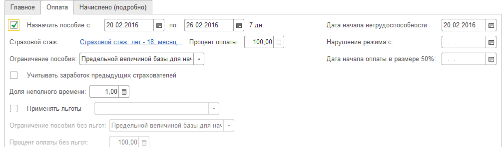Другие параметры оплаты больничного можно просмотреть и уточнить на закладке "Оплата".