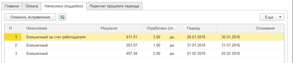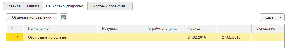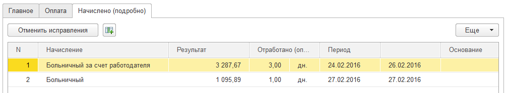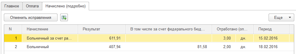 Суммы начислений по больничному листу, как и ранее, отражаются на закладке "Начислено".