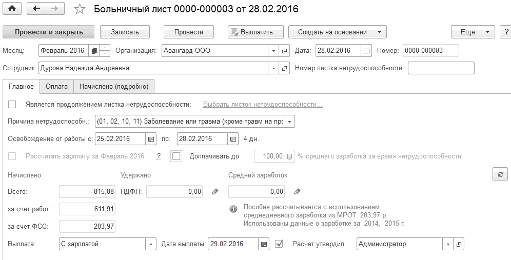 Сотрудница ООО "Авангард" Дурова Н.А. принесла больничный лист по общему заболеванию с 25.02 по 28.02. Введем в программу сведения по больничному листу и рассчитаем ей сумму пособия.