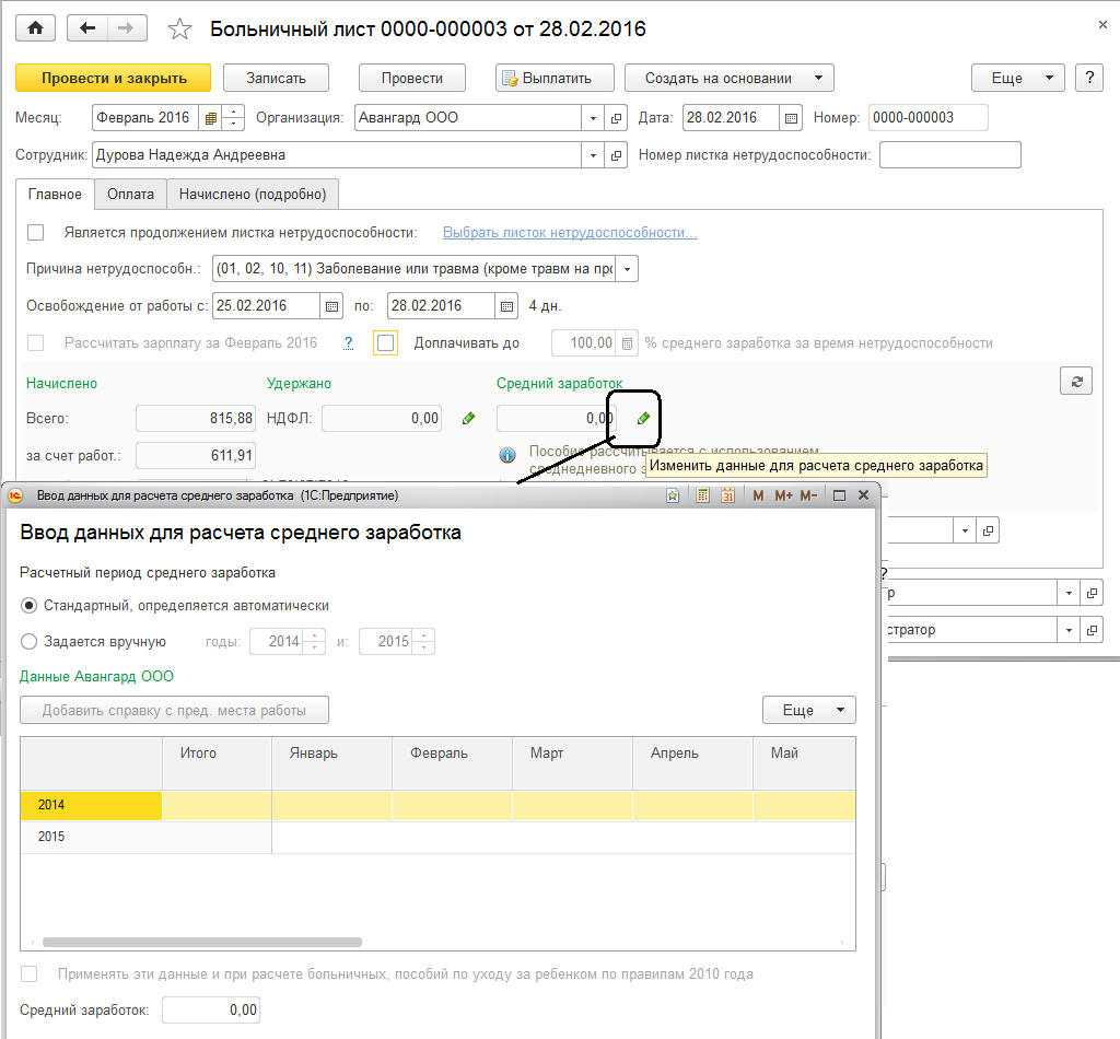 Изменение лет для расчета среднего заработка. Если сотрудник работал в организации долгое время, то при изменении календарных лет, исходя из которых рассчитывается средний заработок, сумму заработка можно отредактировать вручную по ссылке "Изменить". Если сотрудник в организации не работал в эти периоды, то ручные корректировки сумм, как правило, не вводятся, а вводится справка от другого работодателя.