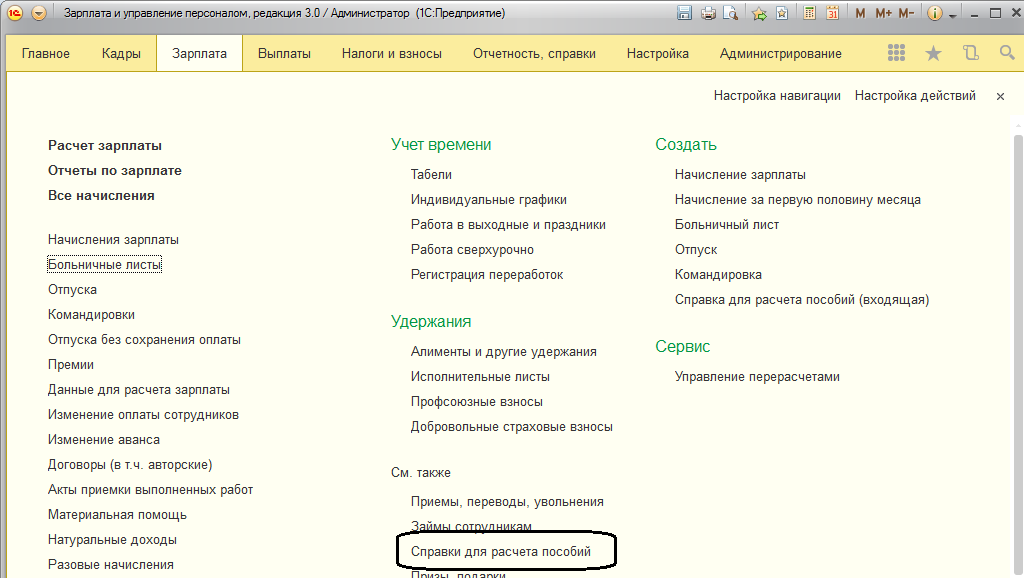 Доступ к документу осуществляется в разделе "Зарплата / Справки для расчета пособий" (блок См. также).