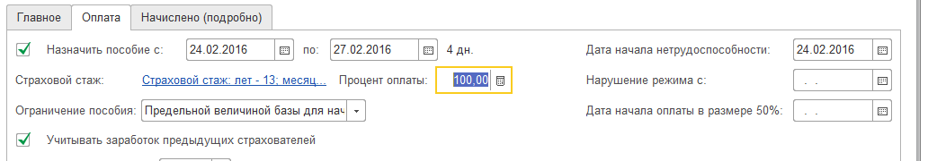 Особенности учета стажа. Процент оплаты больничного (для листков-продолжений копируется из первичного листка нетрудоспособности), а также порядок расчета максимального размера пособия по временной нетрудоспособности (ограничение) определяются автоматически в зависимости от причины нетрудоспособности, даты начала нетрудоспособности и зарегистрированного в информационной базе страхового стажа сотрудника. Стаж вносится в табличную часть "Сведения о стажах" в карточке сотрудника (физического лица) (см. Личные данные сотрудников).