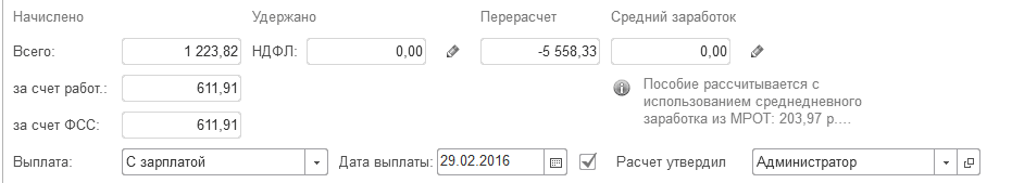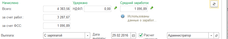 Перейдем на закладку "Оплата" и проставим флажок "Учитывать заработок предыдущих страхователей". Результат будет пересчитан автоматически.