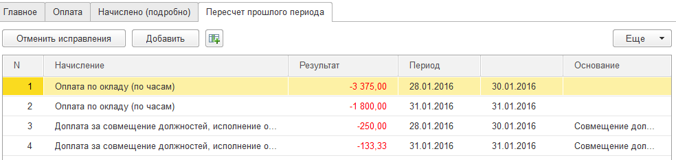 Перерасчеты прошлых периодов. В ситуациях, когда с опозданием в расчетный отдел поступает информация об отклонениях прошлых периодов, чаще всего достаточно просто создать документ, регистрирующий отклонение – благодаря механизму вытеснения произойдет сторнирование оплаты за предыдущий период, и расчет начислений по вытесняющему виду расчета. В документе для отражения перерасчета появится отдельная закладка.