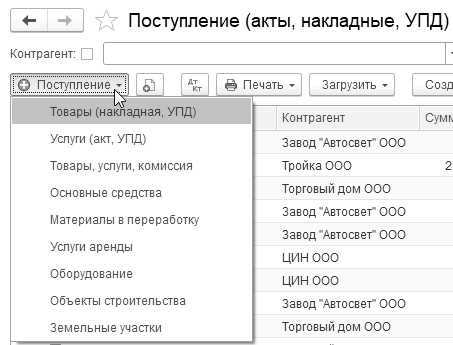 "Поступление (акт, накладная, УПД)", виды поступлений