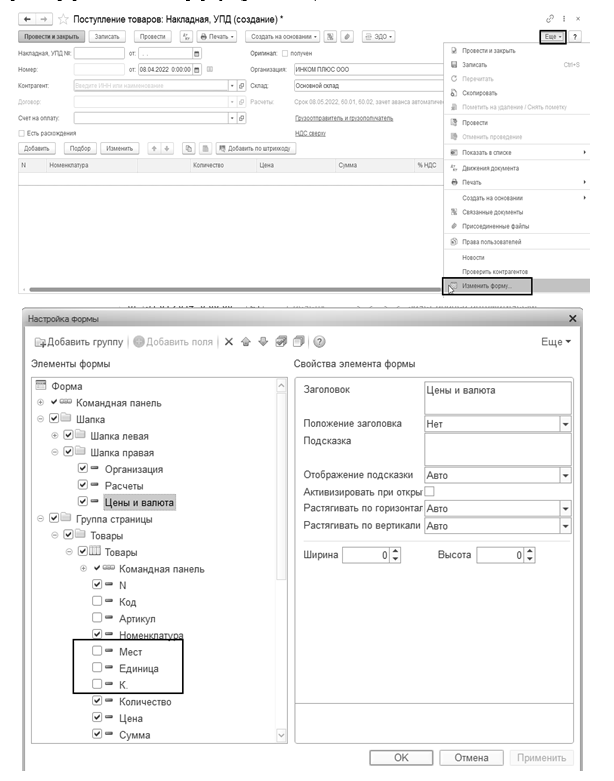 Рис. 24.1.8. Добавление в форму документа "Поступление (акт, накладная, УПД)" новых колонок