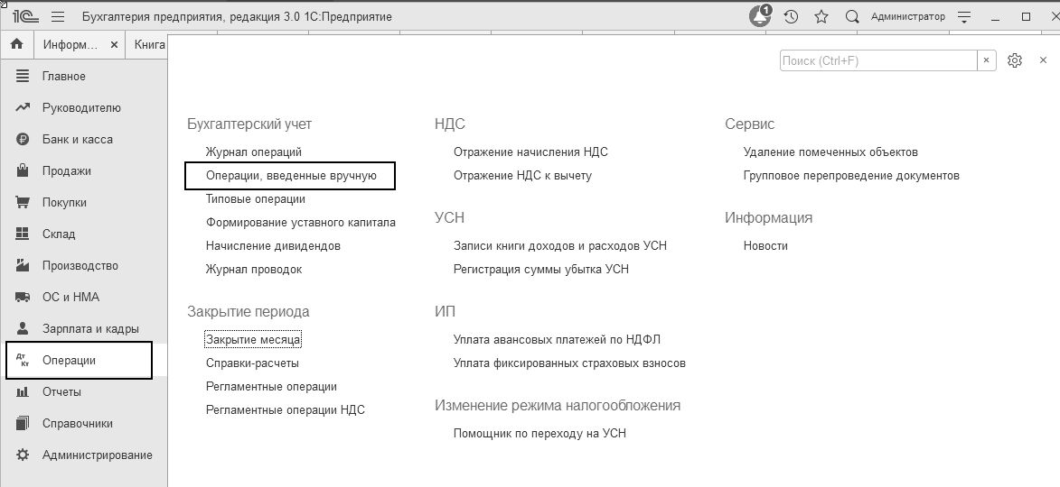Ввести операцию вручную можно через меню "Панель разделов/Операции/Панель навигации/Бухгалтерский учет/Операции, введенные вручную" (рис. 24.1.9).