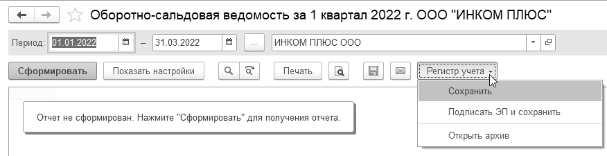 , расположенной в верхней части сформированного отчета "Оборотно-сальдовая ведомость".