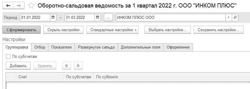 Рис. 24.1.19. Форма настройки отчета "Оборотно-сальдовая ведомость",