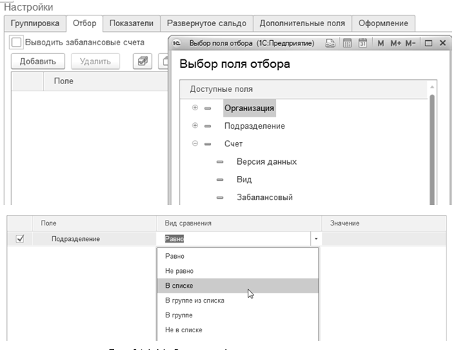 "Оборотно-сальдовая ведомость по счету", закладка "Отбор"