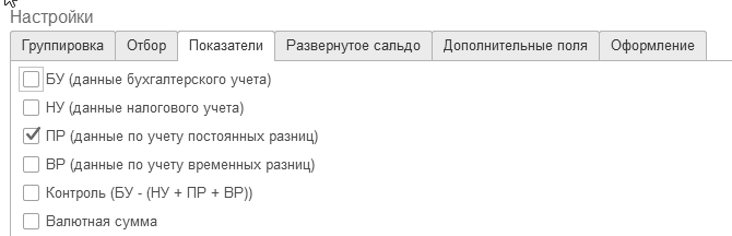 В любом стандартном отчете можно выбрать показатели отчета: БУ, НУ, ПР, ВР, Контроль (в нормальном состоянии равный нулю). Т.е., все итоги (БУ, НУ, ПР, ВР) хранятся вместе. По кнопке "Показать настройки" ("Скрыть настройки") командной панели открываются параметры настройки отчета: группировки по субсчетам, отборы, показатели отчета (БУ, НУ, ПР, ВР и пр.), развернутое сальдо, дополнительные поля настройки, оформление отчета.