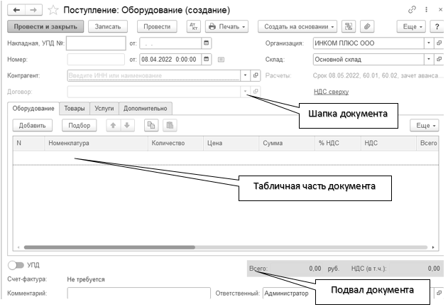 Табличная часть служит для перечисления однотипных сведений. Здесь указываются цены, измерители события, ставка НДС, сумма, счета учета. Внешний вид табличной части зависит от того, какой вид поступлений мы будем сейчас отражать, от него же зависит название формы документа.
