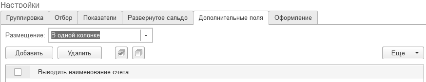Раздел "Дополнительные поля" отличается для каждого отчета. Он может содержать какие-то жесткие элементы управления, свойственные именно этому отчету, и таблицу настраиваемых пользователем полей (рис. 24.1.18). В этой таблице по кнопке "Добавить" можно указать связанные данные, которые тоже нужно вывести в отчет.