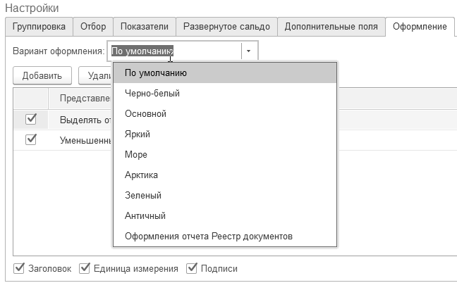 Закладка "Оформление" позволяет настроить вывод в таблицу заголовка отчета, подписей, единицы измерения, варианта оформления, включающего в себя описание цветовой палитры отчета (рис. 24.1.19).
