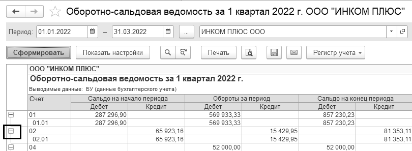 В программе присутствует возможность в уже сформированном отчете отменить детализацию отчета по счетам. Например, в отчете "Оборотно-сальдовая ведомость" пользователю не нужна была бы информация по субсчету 02.01 счета 02 "Амортизация основных средств", то эту детализацию можно было бы убрать, если подвести курсор мыши к левому углу отчета и нажать на пиктограмму