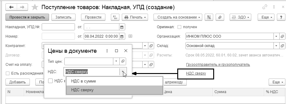 В форме шапки документа присутствует форма "Цены в документе", в которой указываются реквизиты для заполнения табличной части документа: "Тип цен", налоги (цена включает НДС и НДС включать в стоимость), валюта расчетов. Форма предназначена для управления порядком заполнения цены номенклатуры по типу цены.