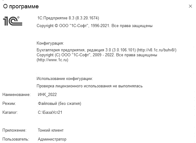 Здесь Вы сможете узнать все о вашей программе. Тут Вы увидите путь, куда установлена Ваша информационная база. А скобки справа подскажут, какая платформа (верхние скобки) и какой релиз программы (нижние скобки) используется Вами. Например,