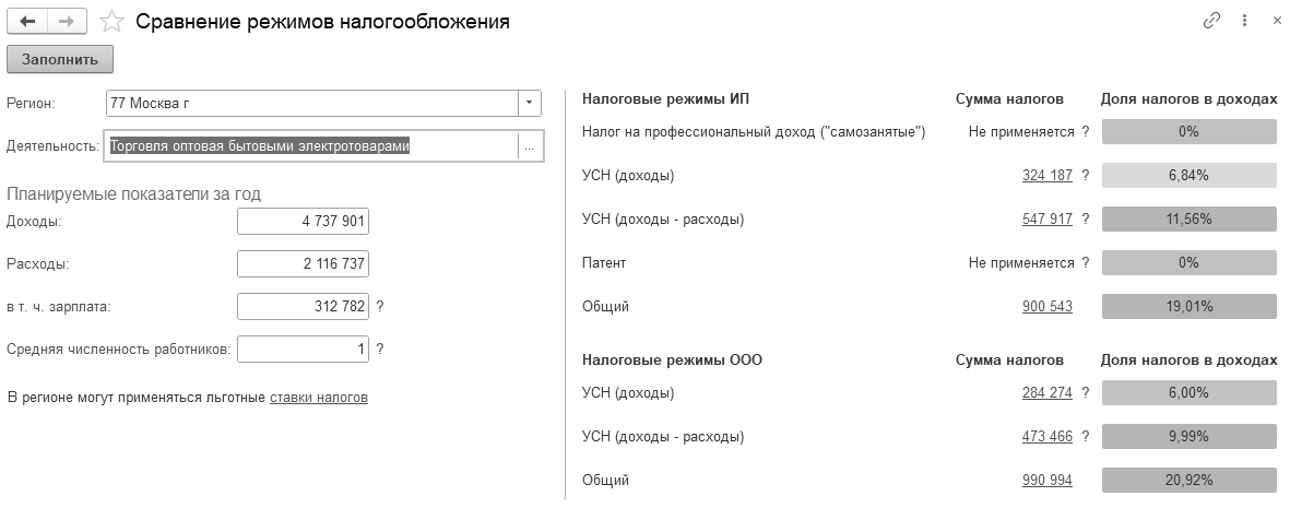Обработка "Сравнение режимов налогообложения", с учетом региональных особенностей, сравнивает режимы: