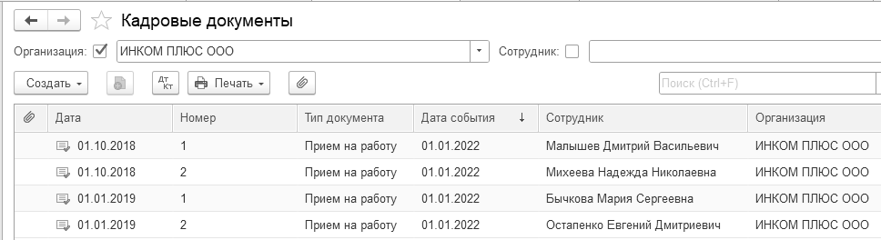При упрощенном кадровом учете кадровые документы не требуются, а все данные хранятся в справочнике "Сотрудники". Из карточки сотрудника можно распечатать кадровые документы.