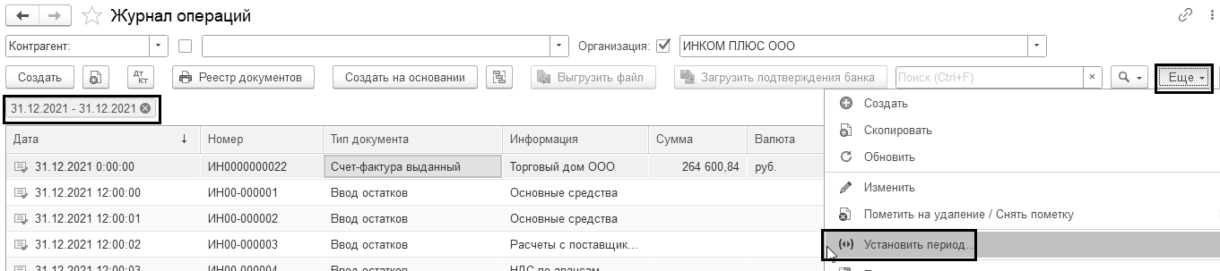 С этим журналом удобно работать в тех случаях, когда надо проследить порядок следования документов. Для этого, в журнале есть графа "Дата", в которой отражается время. Значение времени представляет собой не фактическое время записи документа, а очередность ввода документов в течение одной даты. Если необходимо переставить документы местами, это можно сделать, изменив время документа простым исправлением. По умолчанию список операций в Журналах не ограничен отчетным периодом, который определяется рабочей датой. Поэтому наши операции видны в журнале операций. Если список операций в Журналах ограничен отчетным периодом, можно воспользоваться пунктом меню "Еще/Установить период" (рис. 4.4.2).