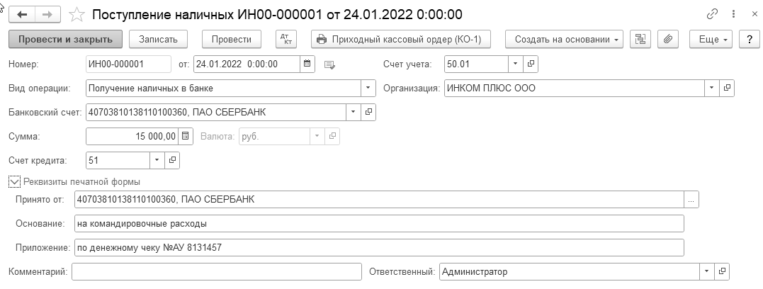 24.01.2022 года из банка с расчетного счета поступили в кассу организации "ИНКОМ ПЛЮС" денежные средства на командировочные расходы в сумме 15 000 руб. по денежному чеку №АУ 8131457.