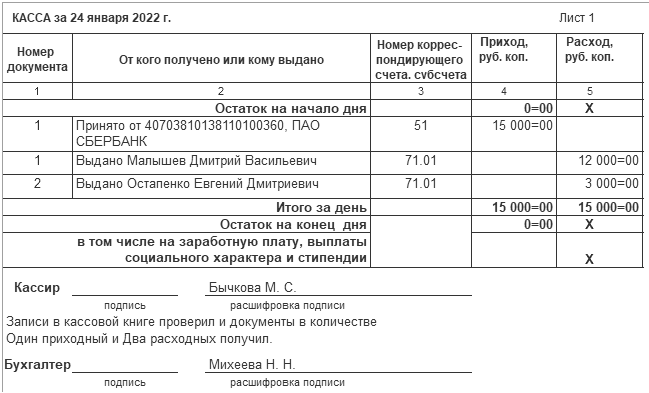 На рисунке 5.3.1 представлен отчет "Кассовая книга" за 24.01.2022 года. За 24 января зафиксировано три кассовых операции. Первая – поступление безналичных денежных средств из банка, и две операции – выдача под отчет. Остатка на конец дня нет.
