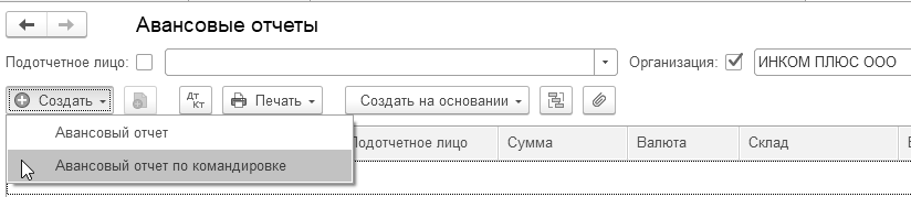 Рис. 6.1.1. Форма выбора документа "Авансовый отчет"