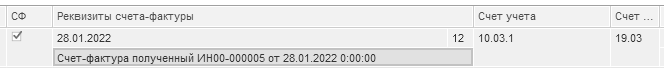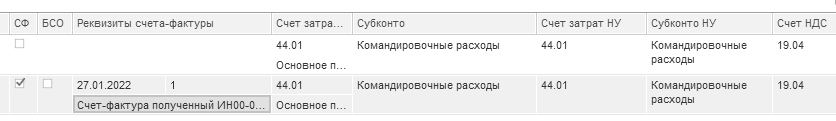 Если аналитика по счету 44.01 в конце строки закладки "Прочее" заполнена не будет (субконто 1 – "Командировочные расходы"), то помощник "Закрытие месяца" счет 44.01 не закроет, и останется остаток на 01.02.2022 года. После проведения авансового отчета в базе зарегистрируются два счета-фактуры, которые сделают проводки по принятию НДС к вычету:
