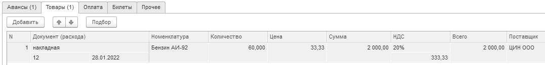 Рис. 6.1.10. Форма документа "Авансовый отчет", закладка "Товары"