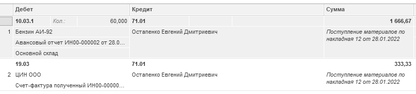 28.01.2022 года принят авансовый отчет от Остапенко Е.Д. о покупке 60 литров бензина АИ-92 на сумму 2 000 руб., НДС 20% в том числе (корр. счет 10.03.1). ООО "ЦИН" представил накладную № 12 и счет-фактуру № 12 от 28.01.2022 года. Бензин оприходован на основной склад.