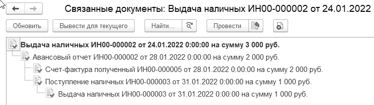 В журнале "Кассовые документы" можно получить информацию о взаимосвязанных документах. Так, если в журнале остановиться на расходном кассовом ордере на сумме 3 000 руб. (Остапенко Е.Д.), и нажать пиктограмму "Связанные документы", то можно получить следующий перечень документов (рис. 6.1.12).
