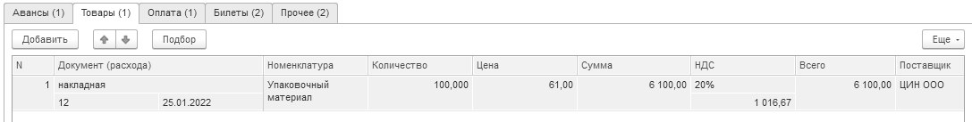 Если стоимость купленных подотчетным лицом ТМЦ требуется отразить на балансе предприятия и вести по ним складской учет, то заполняется закладка "Товары" или "Возвратная тара", где указывается перечень поступивших ТМЦ. По бухгалтерскому и налоговому учету операция будет проведена по дебету счета учета поступивших ценностей.