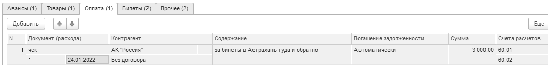 Заполните закладки "Авансы", "Товары", "Оплата", "Билеты" и "Прочее".