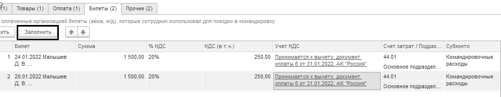 В документе "Авансовый отчет" заполнить закладку "Билеты" при помощи кнопки (рис. 6.1.7).