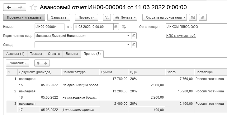 1) на организацию обеда – 17 760 руб. (в том числе НДС 20% – 2 960 руб.). Гостиница "Россия" представила накладную № 15 и счет-фактуру № 15 от 05.03.2022 года;