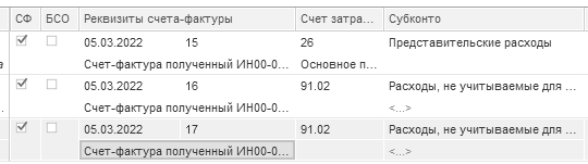После проведения документа "Авансовый отчет" в программе регистрируются документы "Счет-фактура полученный". НДС по представительским расходам нельзя принимать к вычету в полном объеме. Разрешено в предельном размере - 4% от ФОТ за отчетный налоговый период (абз. 3 п.2 ст. 264 НК РФ). Заполнение табличной части документа "Авансовый отчет" показано на рисунках 6.3.1 и 6.3.2.