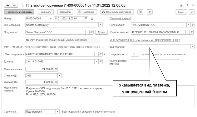 11.01.2022 года перечислите предоплату заводу "АВТОСВЕТ" по договору № 2 от 10.01.2022 года в сумме 24 000 рублей (в т. ч. НДС 20%) за станок универсальный деревообрабатывающий и его разгрузку. На рисунке 7.1.2 показано, как должно быть заполнено платежное поручение для контрагента завод "АВТОСВЕТ".