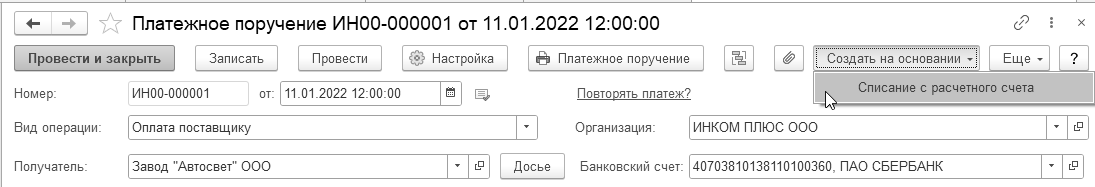 В программе зарегистрировать оплату платежного поручения нужно после получения выписки из банка, например, один из вариантов, при помощи пиктограммы "Еще/Создать на основании/Списание с расчетного счета (рис. 7.1.5).