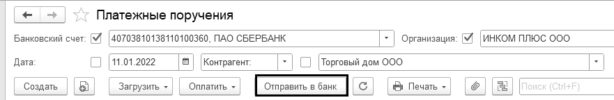 Итак, платежное поручения можно выгрузить в систему "Клиент-банк". Для этого следует находиться в списке документов "Платежные поручения". Остановиться на том документе, который необходимо выгрузить, и нажать кнопку "Отправить в банк/Выгрузить" (рис. 7.7.3).