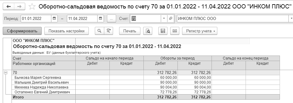 Шаг 8. Для проверки расчетов сформируйте отчет "Оборотно-сальдовая ведомость по счету" 70 за период с 01.01-11.04.2022 года. Остатка на 12.04.2022 года по счету 70 быть не должно (рис. 8.3.3). Аналогично не будет остатков по субсчетам счета 69.