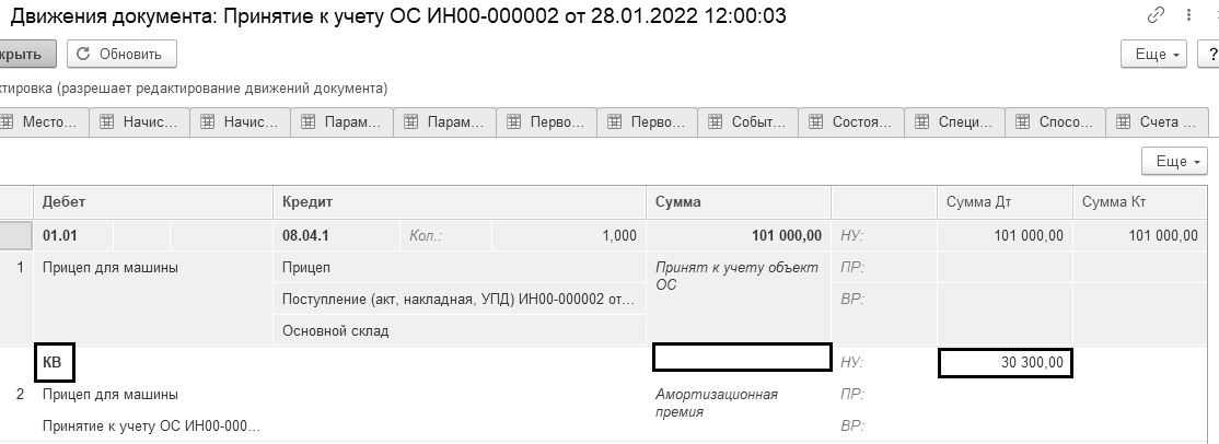 Проведенный документ оформит проводку в дебет счета КВ "Амортизационная премия".