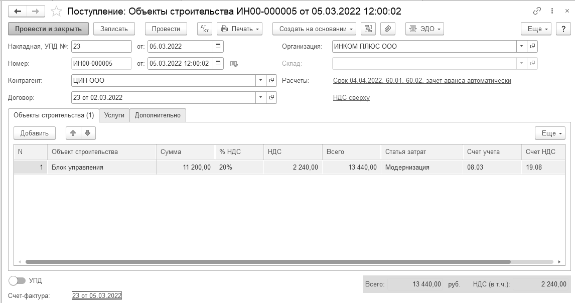 05.03.2022 года ООО "ЦИН" представил накладную № 23 и счет-фактуру № 23 за блок управления. Цена блока управления 11 200 руб. (НДС 20% сверху). Заключен договор № 23 от 02.03.2022 года. Сумма накладной 13 440 руб., в т. ч. НДС.