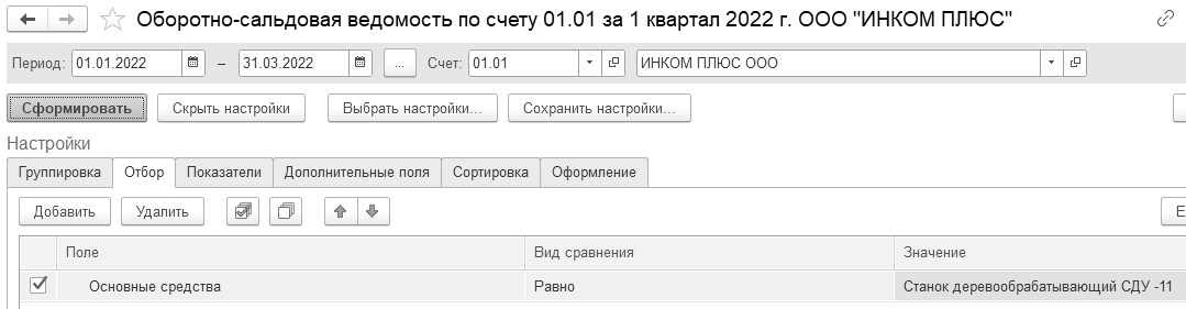 Воспользуйтесь панелью настройки, на закладке "Отбор" укажите основное средство "Станок деревообрабатывающий" (рис. 9.6.5).